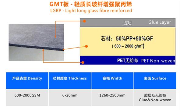 轻质GMT片材具有强度高,冲击韧性高,承载性好,耐高温,质量轻,可再生利用,不易变形,良好的吸音和隔音、无气味等优点。